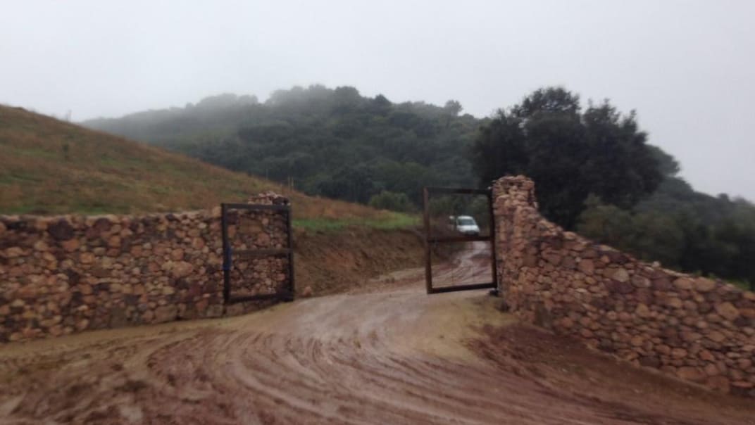 Construcción de entrada que abre paso a esta imponente finca. Realizada con muros de piedra del lugar, mortero de cal y elementos de hierro para su cierre.